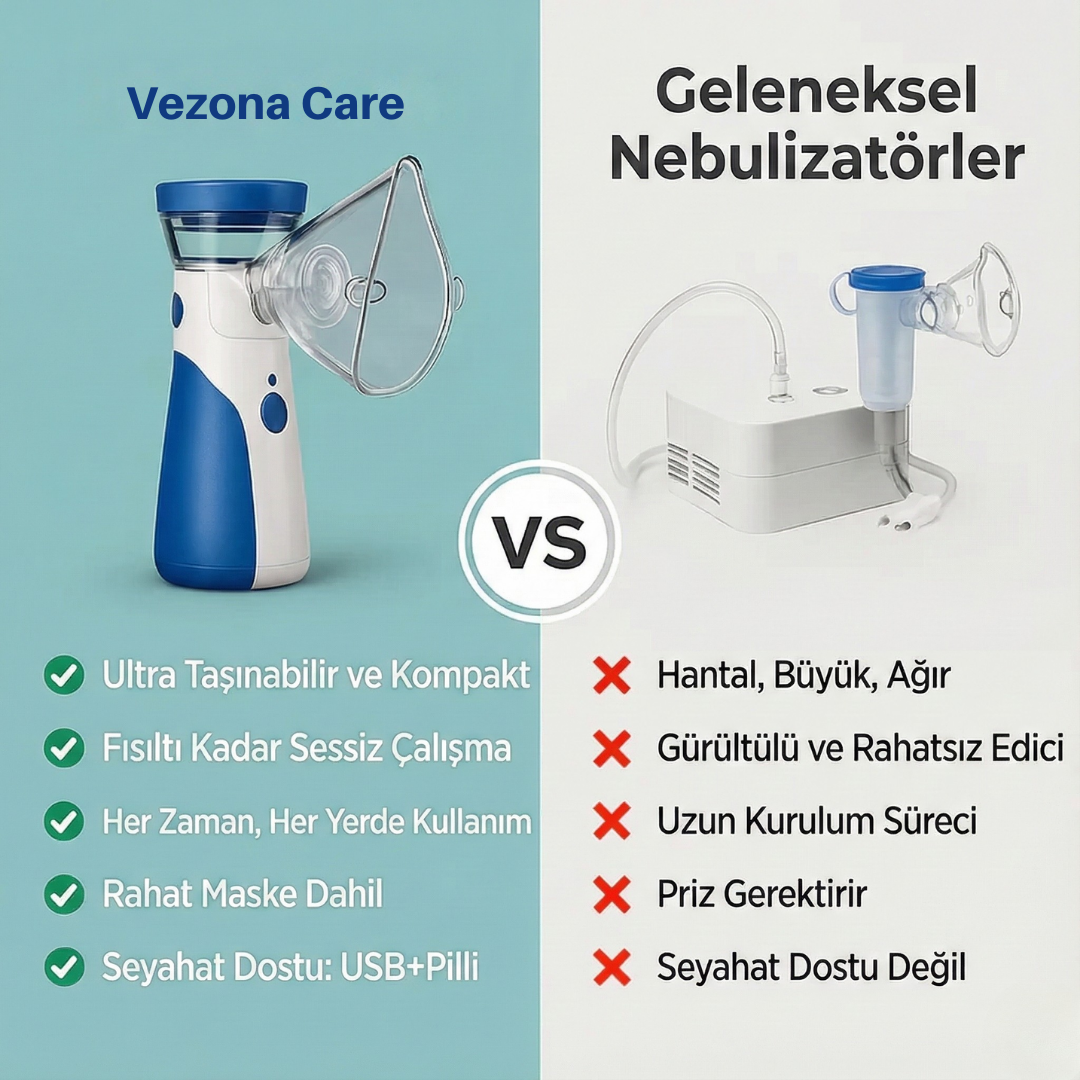 Geleneksel nebülizatörler 60-70 desibel (yaklaşık bir elektrik süpürgesi kadar) ses seviyesinde çalışır. Vezona Care ise 25 dB'nin altında çalışır; fısıltıdan, kütüphane sessizliğinden veya hafif nefes almadan bile daha sessizdir. Çocuğunuz uyurken onu uyandırmadan kullanabilirsiniz.