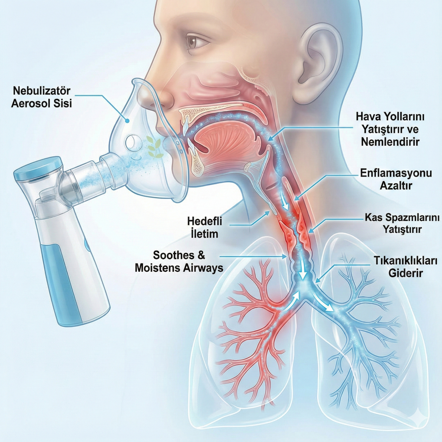 Nebulizatör, tahriş olmuş solunum yollarını nemlendirmeye ve yatıştırmaya yardımcı olan ince, yumuşak bir sis sağlar. Bu, soğuk hava, hastalık veya kronik rahatsızlıklar nedeniyle solunum zorluğu çekildiğinde nefes almayı daha rahat ve konforlu hale getirebilir.